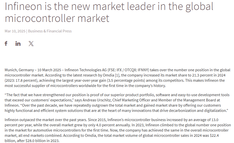 (3)英飞凌发文正式登顶全球MCU销冠,市场份额高达21.3%
