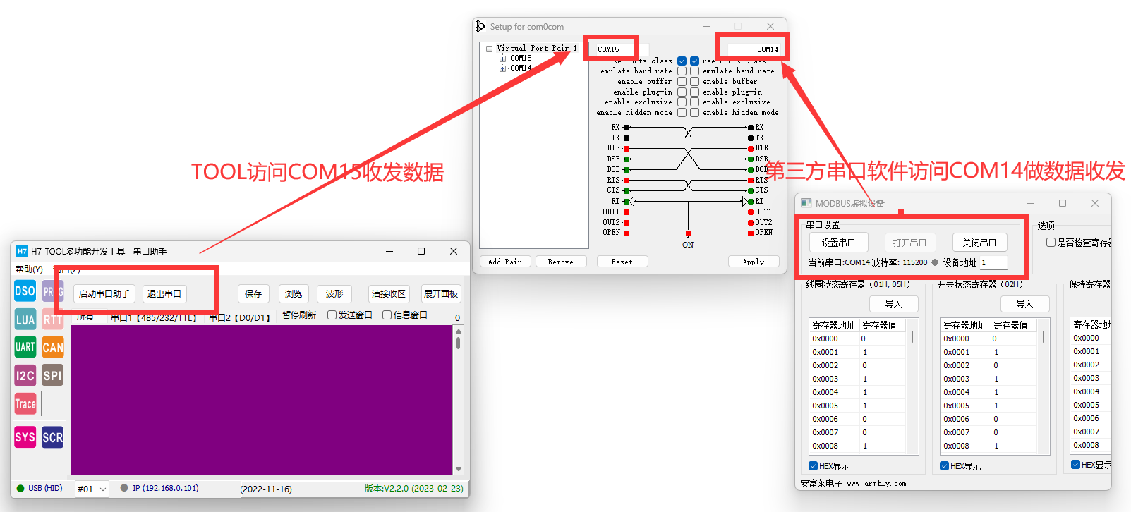 原理比较简单,使用com0com软件可以虚拟出来两个串口,比如我这里出来了com14和com15,然后我就可以让TOOL上位机和第3方串口软件访问这两个虚拟串口进行通信