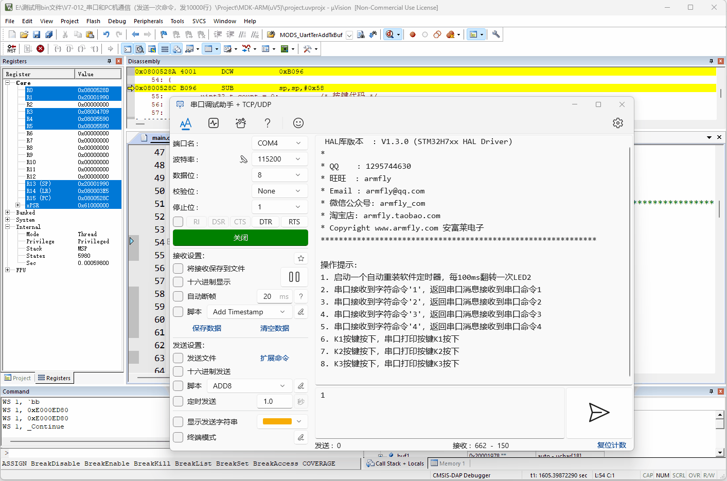 (5)MDK使用DAPLINK调试状态和第3方串口助手同时使用效果