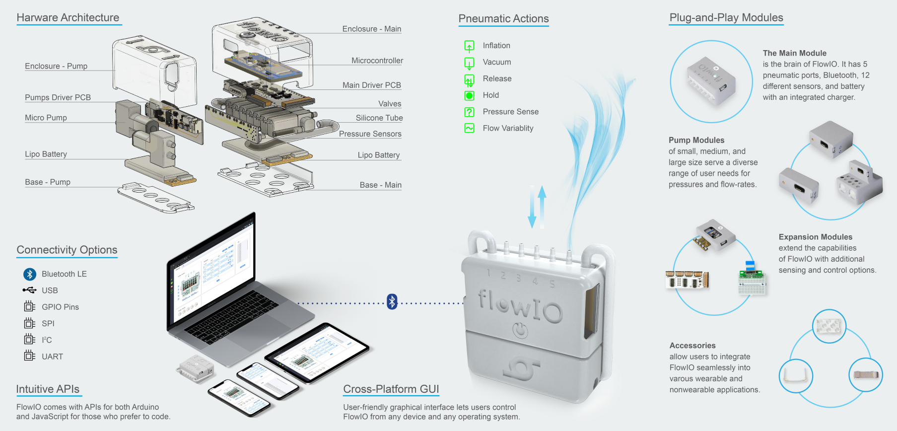 FlowIO是一个模块化气动开发平台,使软体机器人和可编程材料的原型设计变得非常方便,FlowIO对软体机器人的作用就像Arduino对电子产品的作用一样。