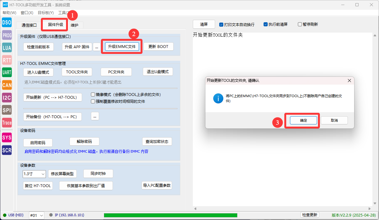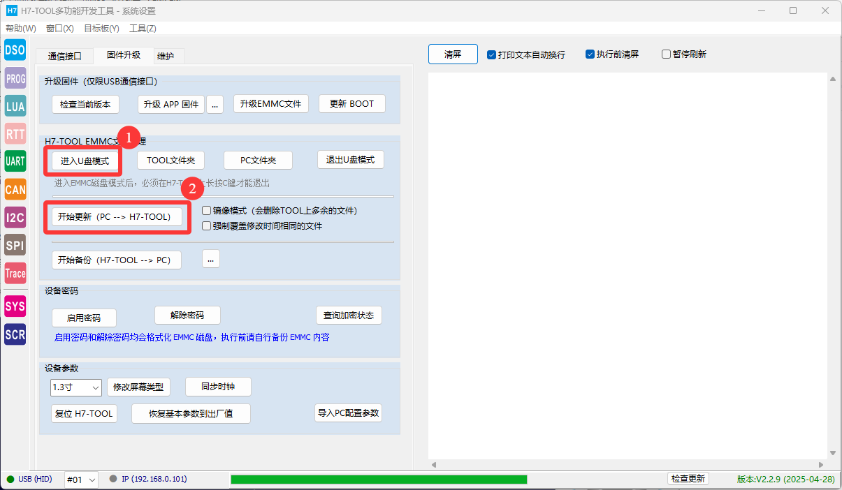 注:如果更新APP失败,从TOOL端拔掉USB线,旧版TOOL长按S键,新版TOOL长按OK键,插入USB线,3秒后松手,正常会看到电脑端有个虚拟U盘。然后拖拽上位机软件包路径h7toolPC_release\EMMC\H7-TOOL\Firmware里面的APP固件到虚拟U盘,待传输完毕后,TOOL会自动重新启动。