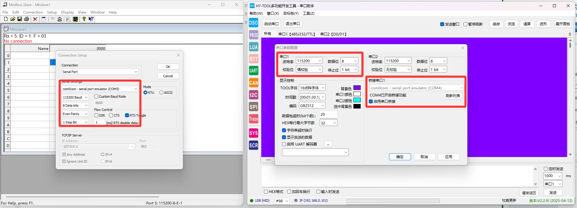 板子进入bootloader后,STM32CubeProg连接桥接出来的COM5,H7-TOOL连接的COM4, 通过com0com做的数据互通