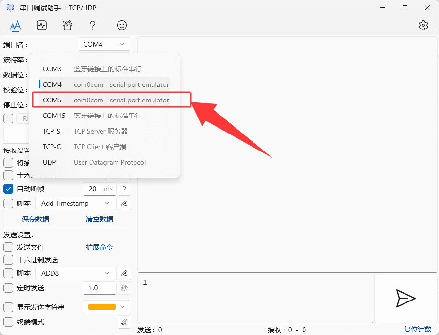 (1)接下来的桥接使用就比较简单了,我们这里虚拟出来了COM4和COM5,然后让TOOL上位机打开一个COM4,第3方串口软件打开一个COM5,或者反过来都可以。