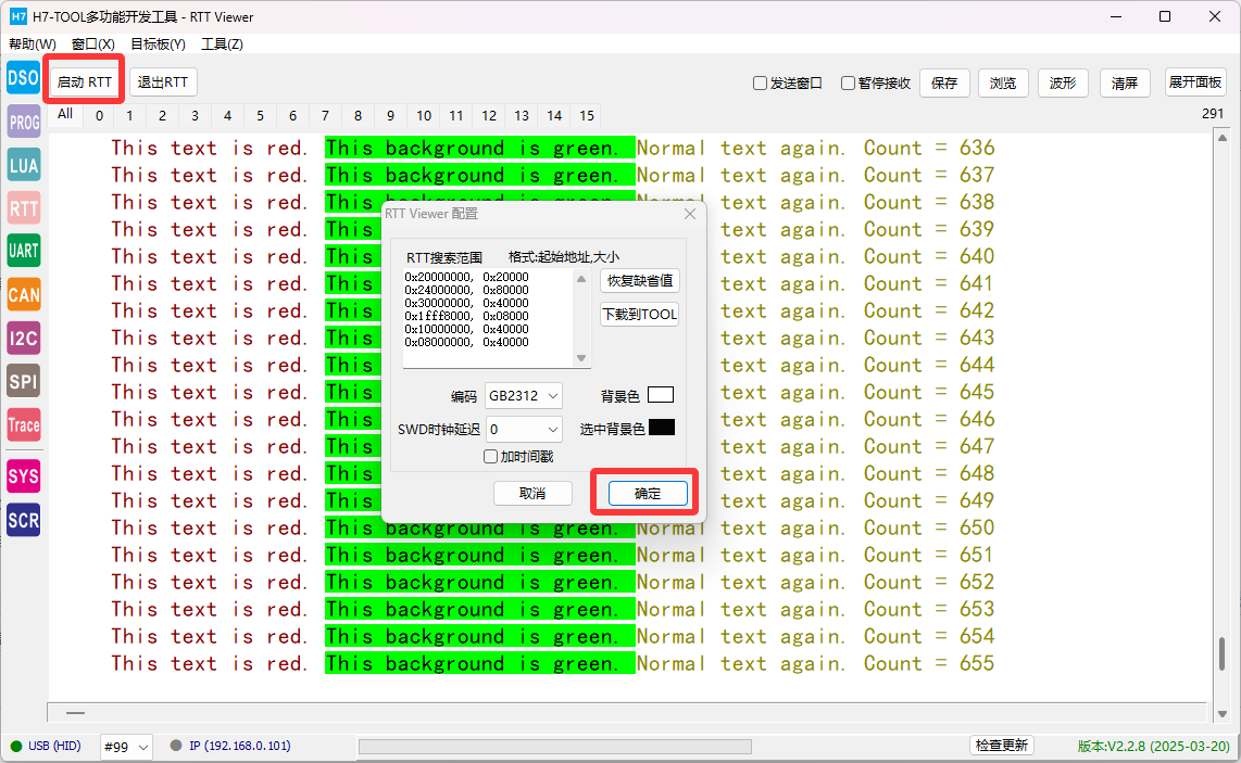 4、RTT通道0汇总显示(支持字体前景色和背景色 )