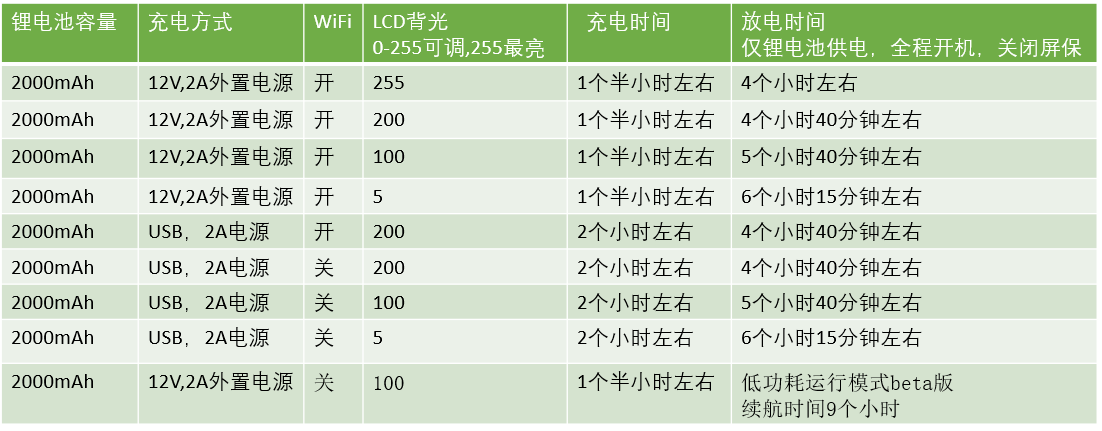 (1)推荐实际应用将LCD背光设置为100, 可以开机全程运行6个小时左右