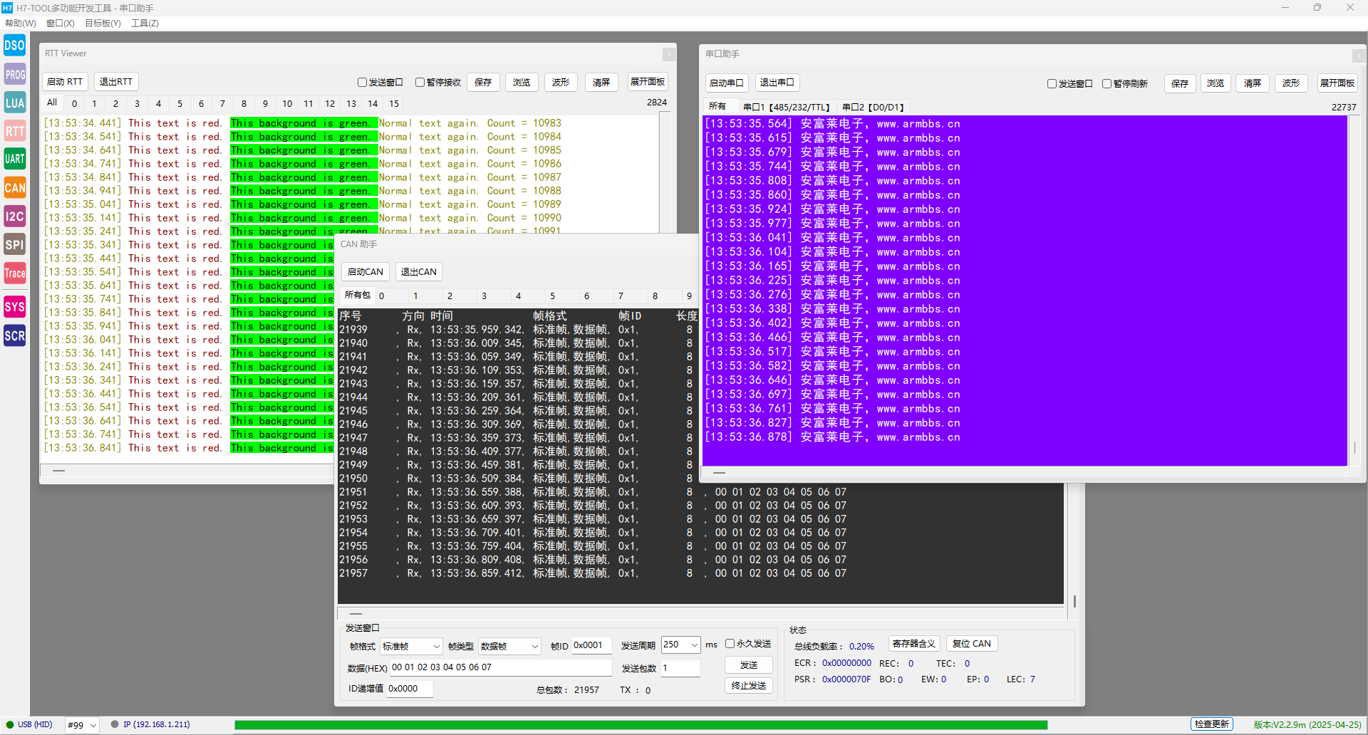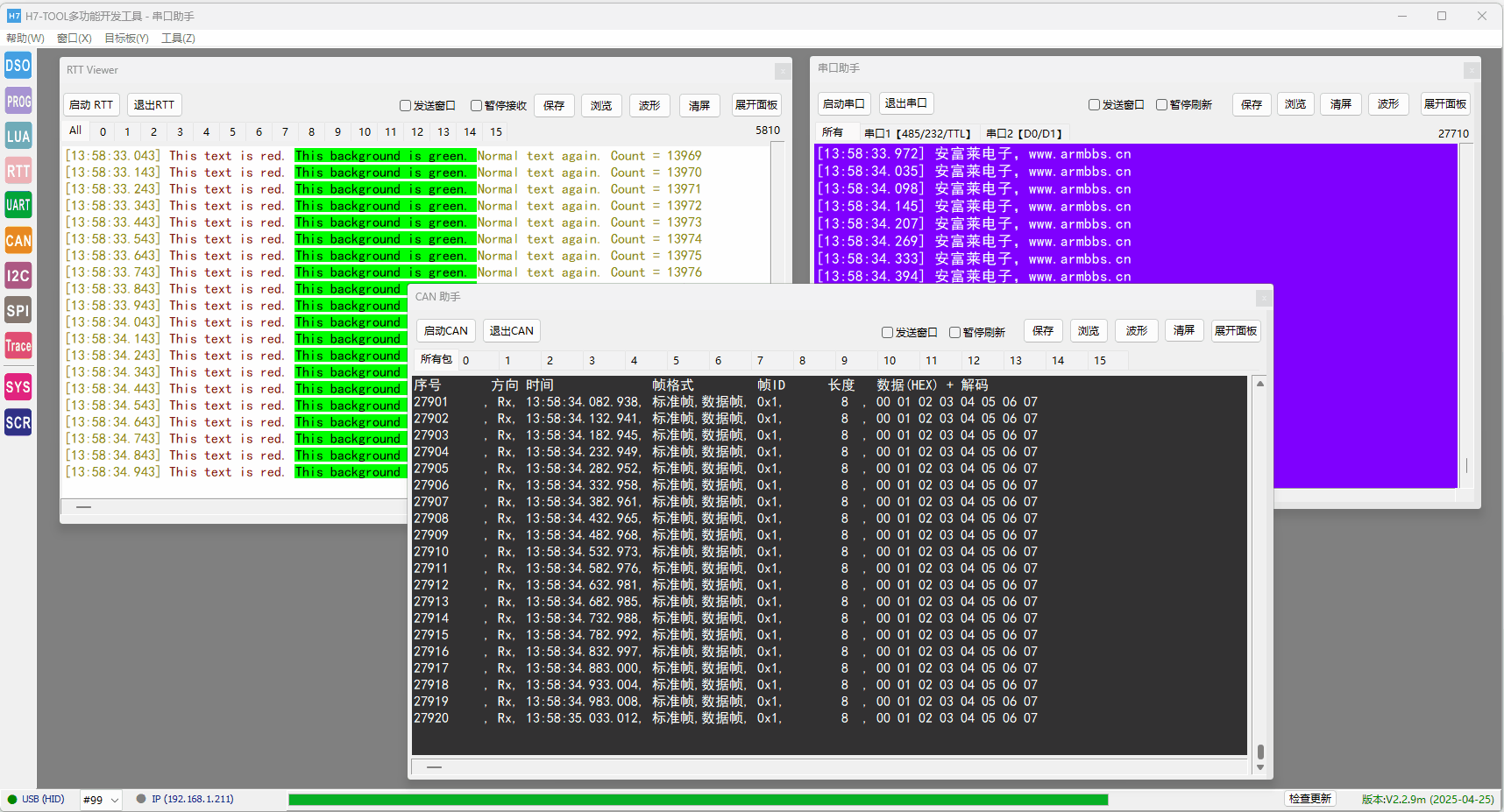 根据大家的建议,上个月发布的2.28版本,已经支持了CAN, UART和RTT三合一模式,同时收发且实时记录数据,但没有将窗口悬浮出来。