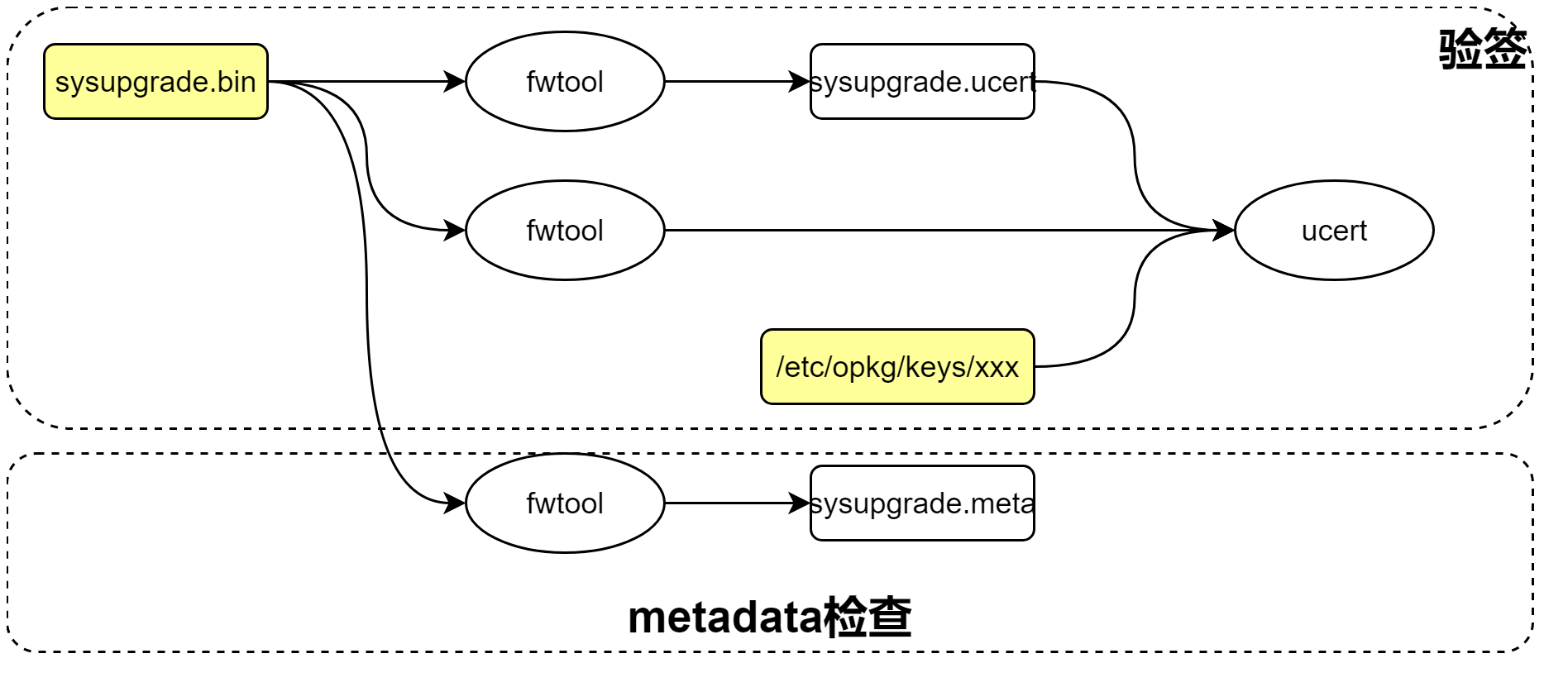 - 升级过程中如果REQUIRE_IMAGE_SIGNATURE为1,则必须检查签名。REQUIRE_IMAGE_METADATA为1,则必须检查metadata。失败则停止。除非使用sysupgrade -F强制更新。