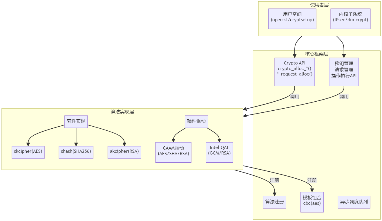 | 核心框架层 | 提供统一API、算法管理、请求调度和模板组合 | crypto_alloc_*() API、算法注册表、模板引擎(如cbc(aes))、异步调度队列 |