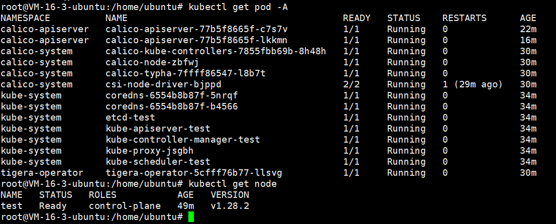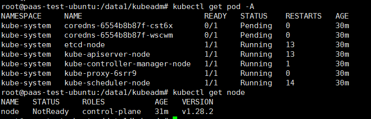 安装好的信息: [bootstrap-token] Configured RBAC rules to allow certificate rotation for all node client certificates in the cluster [bootstrap-token] Creating the "cluster-info" ConfigMap in the "kube-public" namespace [kubelet-finalize] Updating "/etc/kubernetes/kubelet.conf" to point to a rotatable kubelet client certificate and key [addons] Applied essential addon: CoreDNS [addons] Applied essential addon: kube-proxy Your Kubernetes control-plane has initialized successfully! To start using your cluster, you need to run the following as a regular user: mkdir -p $HOME/.kube sudo cp -i /etc/kubernetes/admin.conf $HOME/.kube/config sudo chown $(id -u):$(id -g) $HOME/.kube/config Alternatively, if you are the root user, you can run: export KUBECONFIG=/etc/kubernetes/admin.conf You should now deploy a pod network to the cluster. Run "kubectl apply -f [podnetwork].yaml" with one of the options listed at: https://kubernetes.io/docs/concepts/cluster-administration/addons/ Then you can join any number of worker nodes by running the following on each as root: kubeadm join 192.168.3.68:6443 --token abcdef.0123456789abcdef \ --discovery-token-ca-cert-hash sha256:3a158c08c3dd180ced3dd6576cb8c839d90aadd0219c98d4fbfe327a0151d0f8