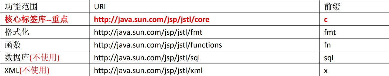 - JSTL由五个不同功能的标签库组成,先导包,taglibs-tandar-impl-1.21.jar 、 taglibs-tandar-spec-1.21.jar 在向JSP标签库中使用taglib指令引入标签库 <%@ taglib prefix='c' uri=" " %>