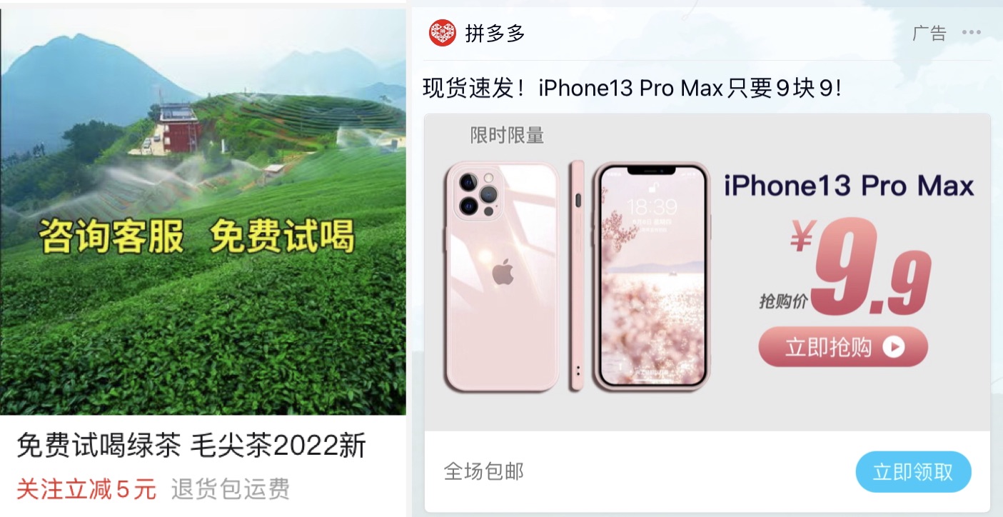 他们就可能给你推广一些类似于免费领取茶叶、9块9包邮iPhone13 Pro Max的广告。