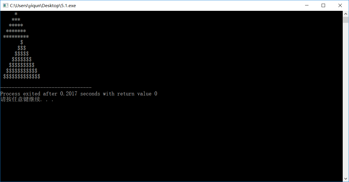 #include "graph.h" #include <iostream> using namespace std; Graph::Graph(char ch, int t): symbol(ch), size(t) { } void Graph::draw() { int i,j,k; for(i=1;i<=size;i++) { for(k=size-i;k>=0;k--) { cout<<" "; } for(j=0;j<2*i-1;j++) { if(j<2*i-2) cout<<symbol; if(j==2*i-2) cout<<symbol<<endl; } } }