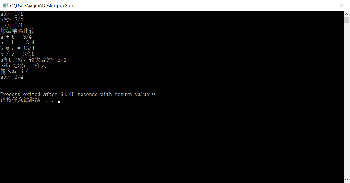 using namespace std; Fraction::Fraction(int t,int b):top(t),bottom(b){ } Fraction::Fraction(int t):top(t) { bottom = 1; } Fraction::Fraction() { top = 0; bottom = 1; } Fraction::~Fraction(){ } void Fraction::add(Fraction &f) //加 { cout << top * f.bottom + f.top * bottom << "/" << bottom * f.bottom << endl; } void Fraction::subtract(Fraction &f) //减 { cout << top * f.bottom - f.top * bottom << "/" << bottom * f.bottom << endl; } void Fraction::multiply(Fraction &f) //乘 { cout << top * f.top << "/" << bottom * f.bottom << endl; } void Fraction::divide(Fraction &f) //除 { cout << top * f.bottom << "/" << bottom * f.top << endl; } void Fraction::compare(Fraction &f) //比较大小 { if (top * f.bottom > bottom * f.top) cout << top << "/" << bottom << endl; else if (top * f.bottom < bottom * f.top) cout << f.top << "/" << f.bottom << endl; else if (top * f.bottom == bottom * f.top) cout << "一样大" << endl; } void Fraction::input() { cin >> top >> bottom; } void Fraction::output() { cout << top << "/" << bottom << endl; }