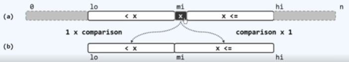 while ( lo < hi ) { //每步迭代可能要做两次比较判断,有三个分支