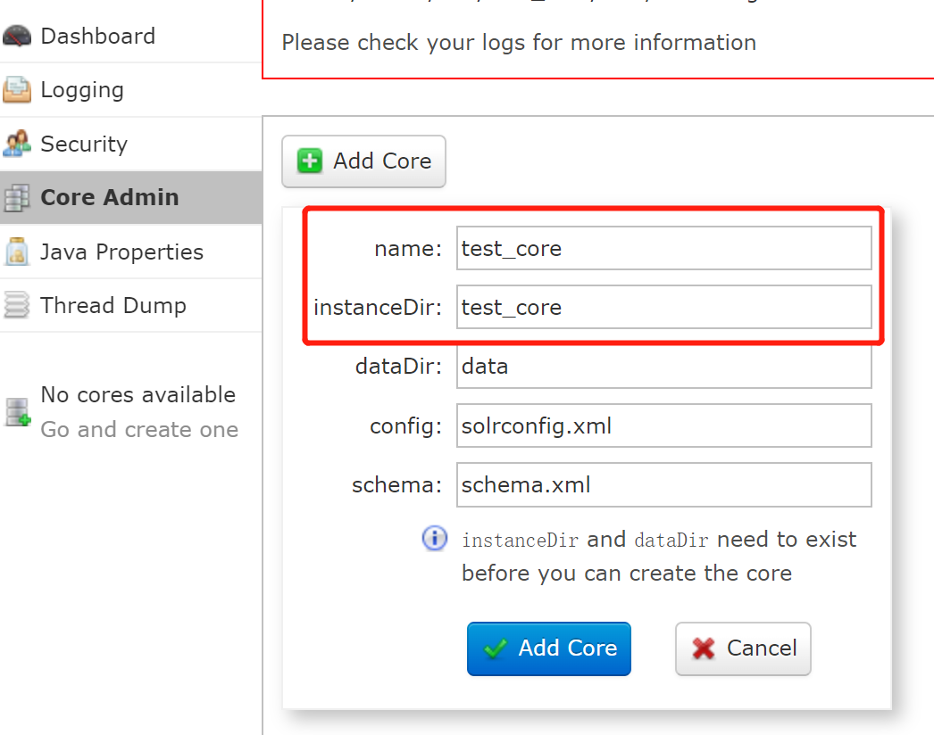 instanceDir需要和上面创建的文件夹名一致,确认信息后,点击Add Core: