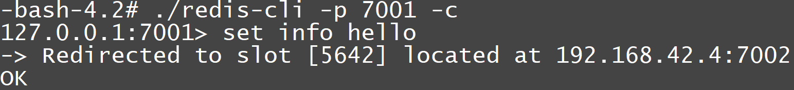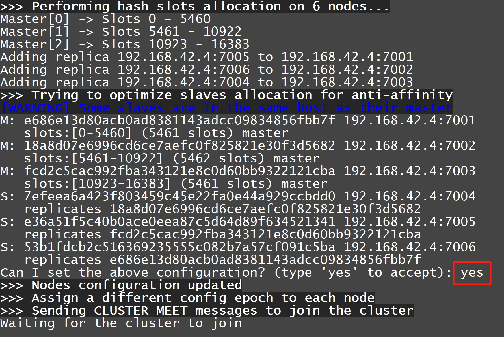 ./redis-cli --cluster create 192.168.42.4:7001 192.168.42.4:7002 192.168.42.4:7003 192.168.42.4:7004 192.168.42.4:7005 192.168.42.4:7006 --cluster-replicas 1