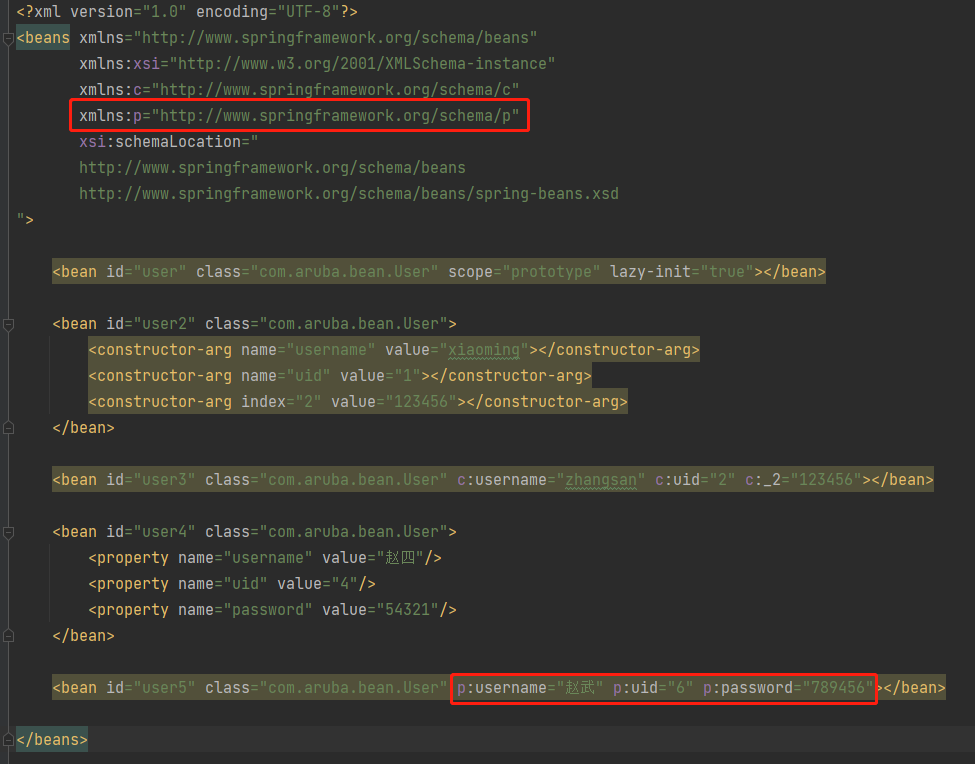<bean id="user8" class="com.aruba.bean.User" p:username="赵武" p:uid="6" p:password="789456">