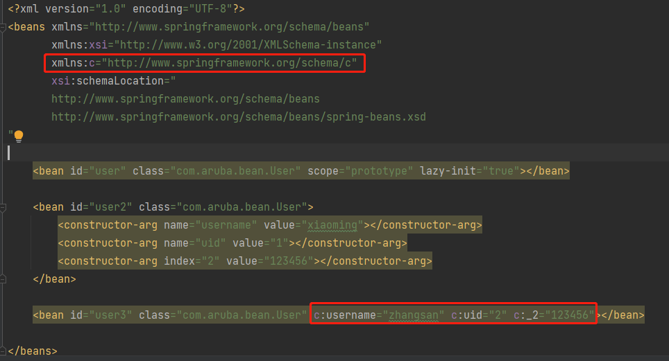 <bean id="user" class="com.aruba.bean.User"></bean>