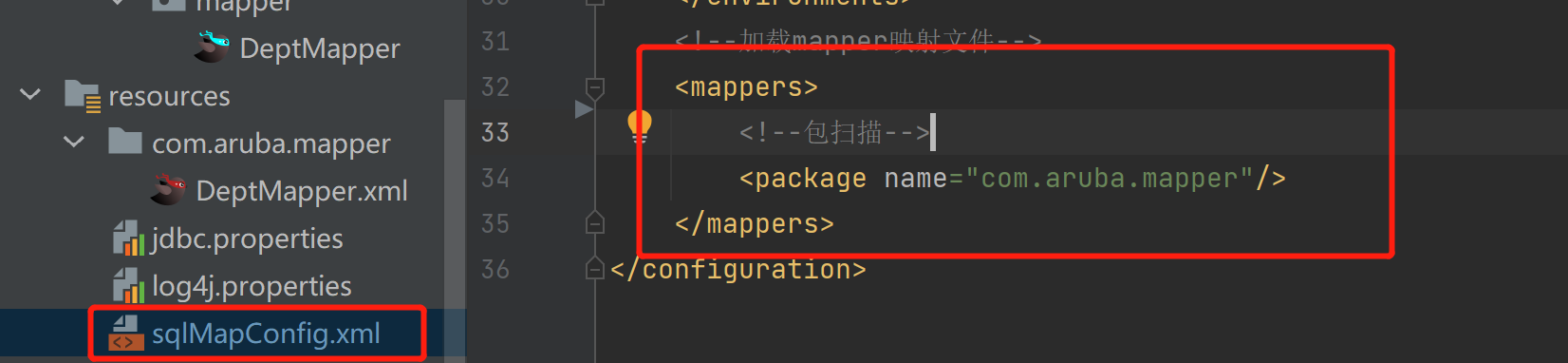 3. Mybatis配置文件中只需要加入包扫描