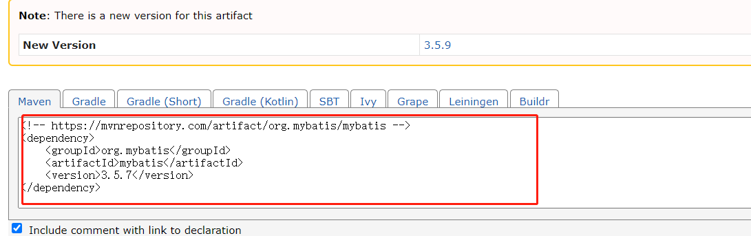 Maven中心搜索mybatis,这边根据个人习惯,使用热度高的版本