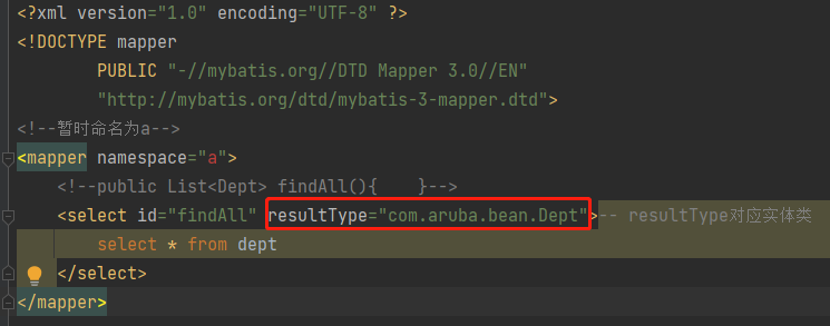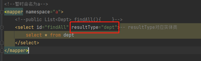 在映射文件DeptMapper.xml中,目前resultType需要使用全包名: