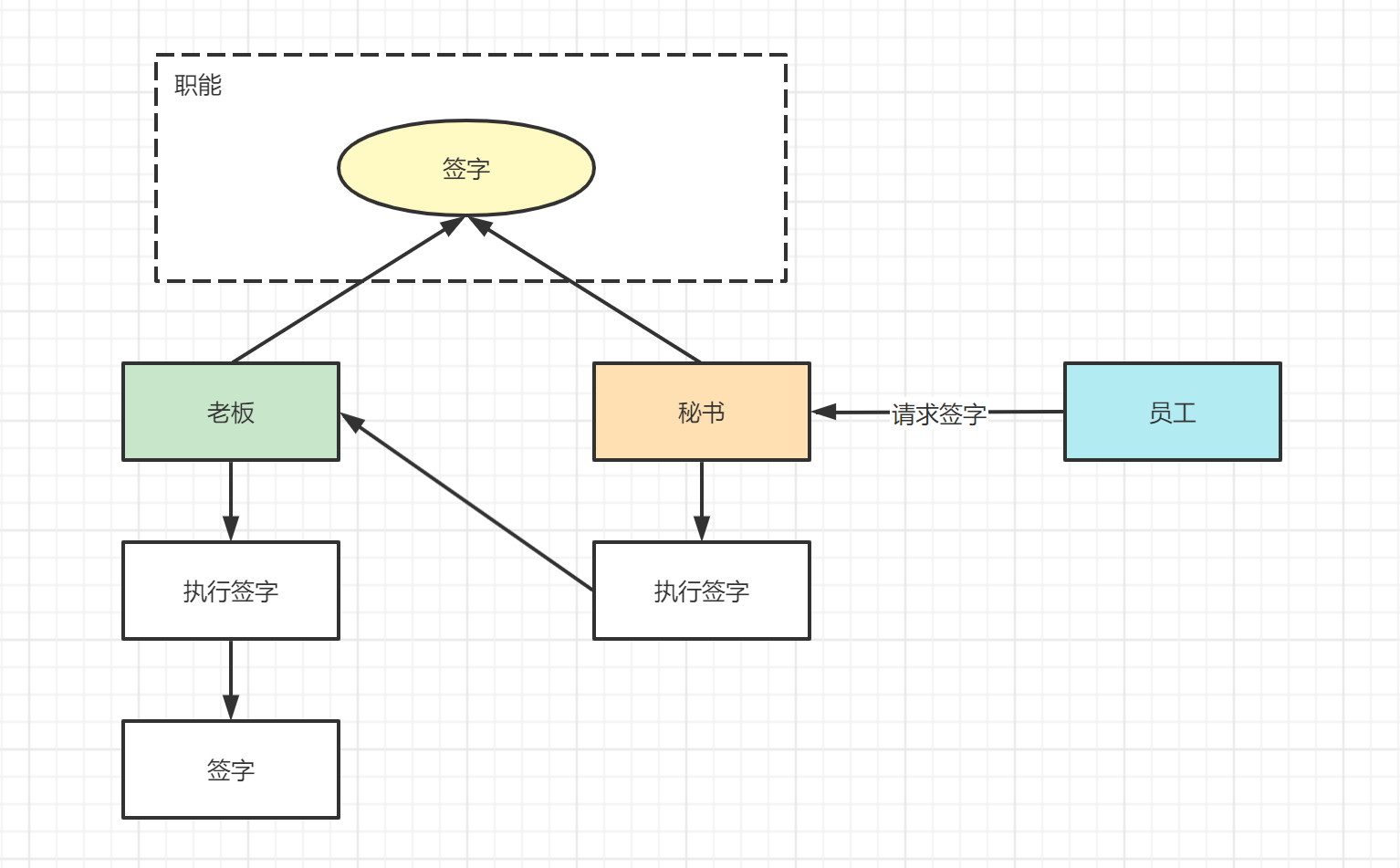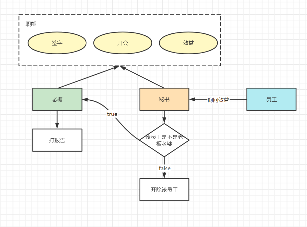 有一名员工A,他出于某些原因需要公司签字,老板和秘书都可以执行公司签字的职能,但是秘书没有直接签字的权力,真正签字的必须是老板,而员工并不能直接找老板签字,只能和秘书打交道。由此看出,秘书只是一个代理者,他和老板拥有相同的职能,但是最终执行职能的还是老板,是员工和老板中间的窗口