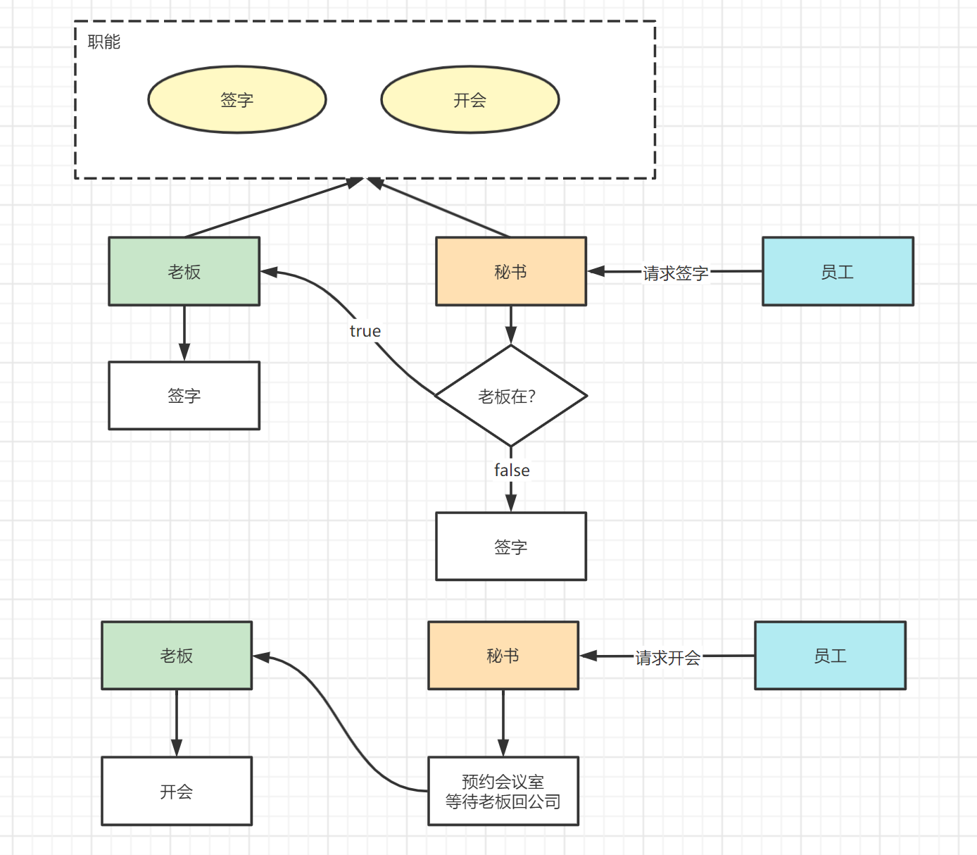 老板很忙,不一定一直都在公司,现在秘书也可以签名了,但是老板在的时候,还是优先老板签名。公司职能新增了开会,开会必须要等待老板在场