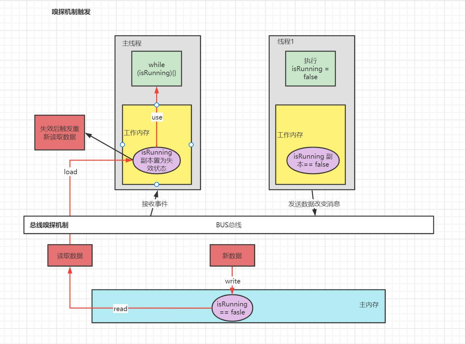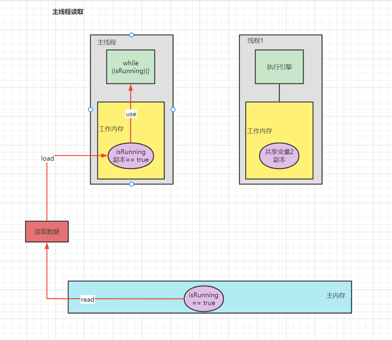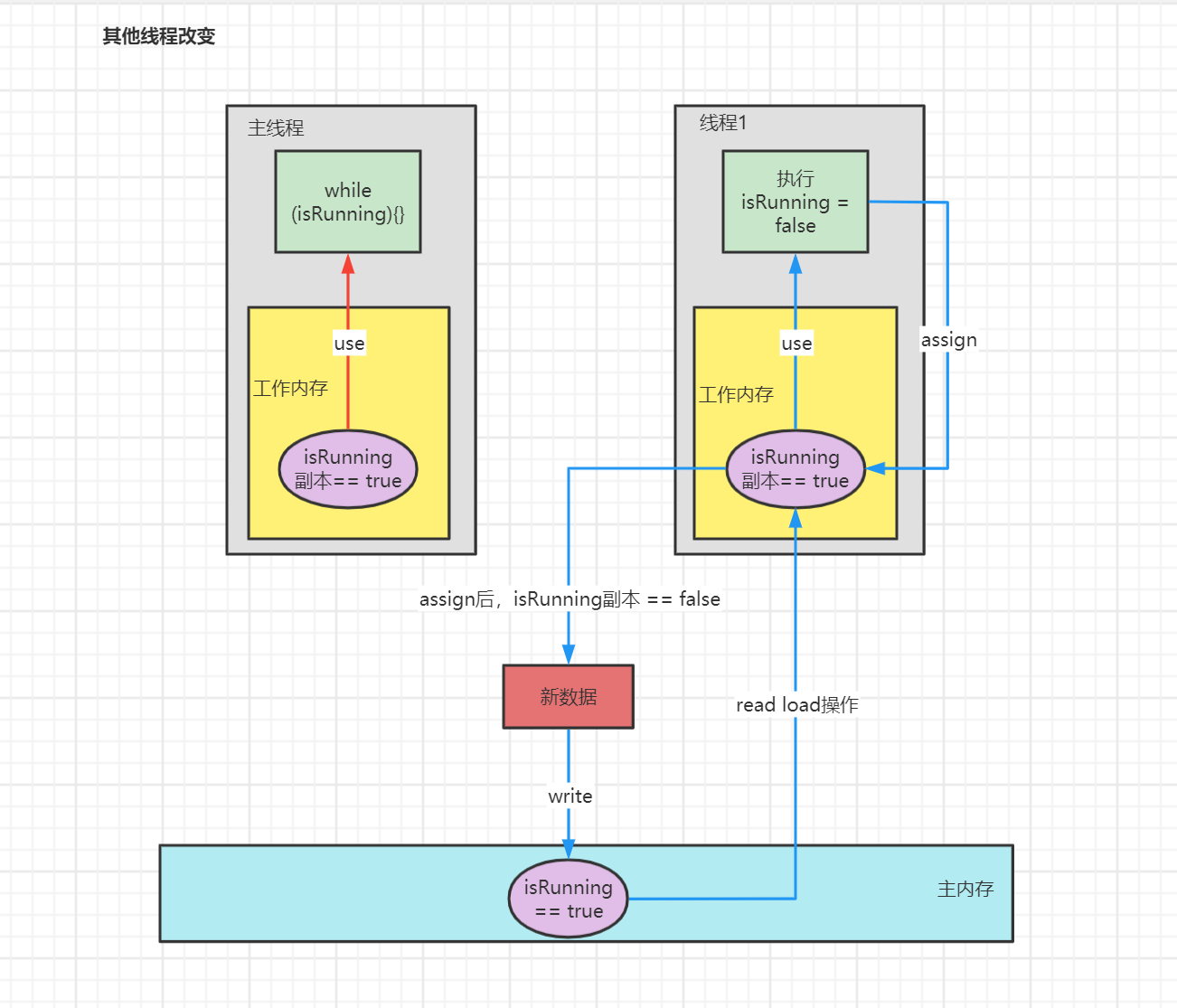主线程一直在对isRunning变量的副本做判断,而主线程的isRunning变量副本存的值,在最初读取isRunning变量时就是true,虽然另一个线程对isRunning进行了操作,并且也成功的将false写入到了变量中,但是线程的工作内存是私有的,主线程并不知道isRunning发生了改变**,所以主线程中的副本一直都是true,循环并不会退出共享变量对所有线程都可见,但线程工作内存中是私有的,里面的副本对外不可见