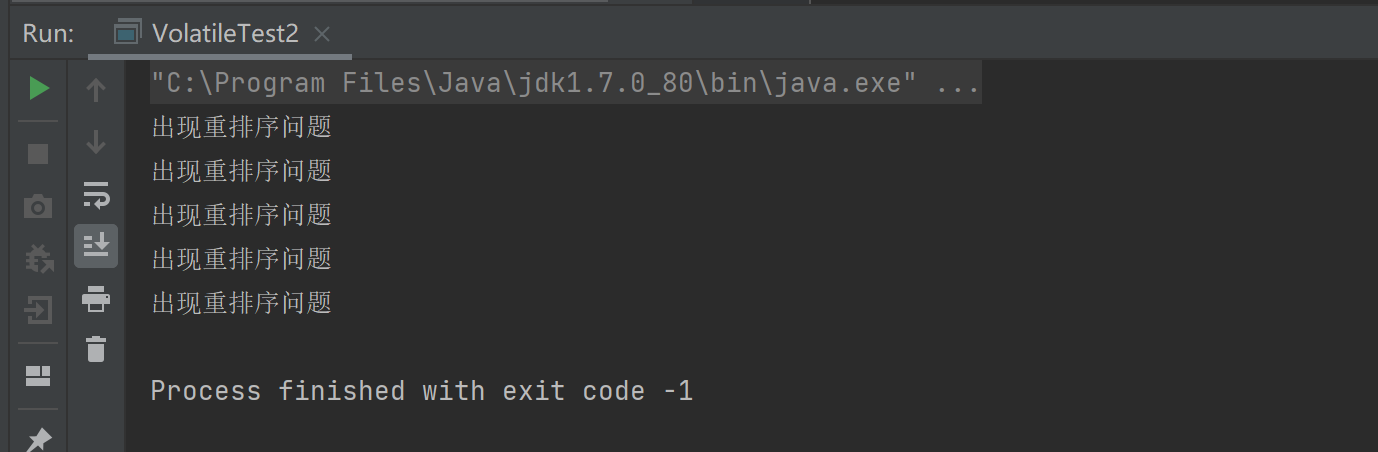 主线程先进入while循环,另一个线程200ms后,对isRunning赋值为false,可运行的结果并没有合我们的意,主线程一直在while循环中