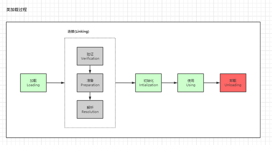 有了前面的了解,我们知道Java文件先要编译成class文件,再由JVM加载class到方法区成为类元信息,最后实例化class对象,加载类的过程又可以细分为:加载、连接、初始化、使用、卸载