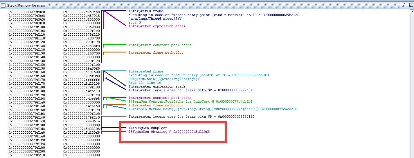 再次执行jps命令,查看进程id,并使用HSDB工具查看,最后的内存为下图: