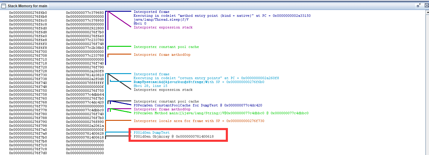 可以看到现在的DumpTest对象处于老年代(OldGen)区