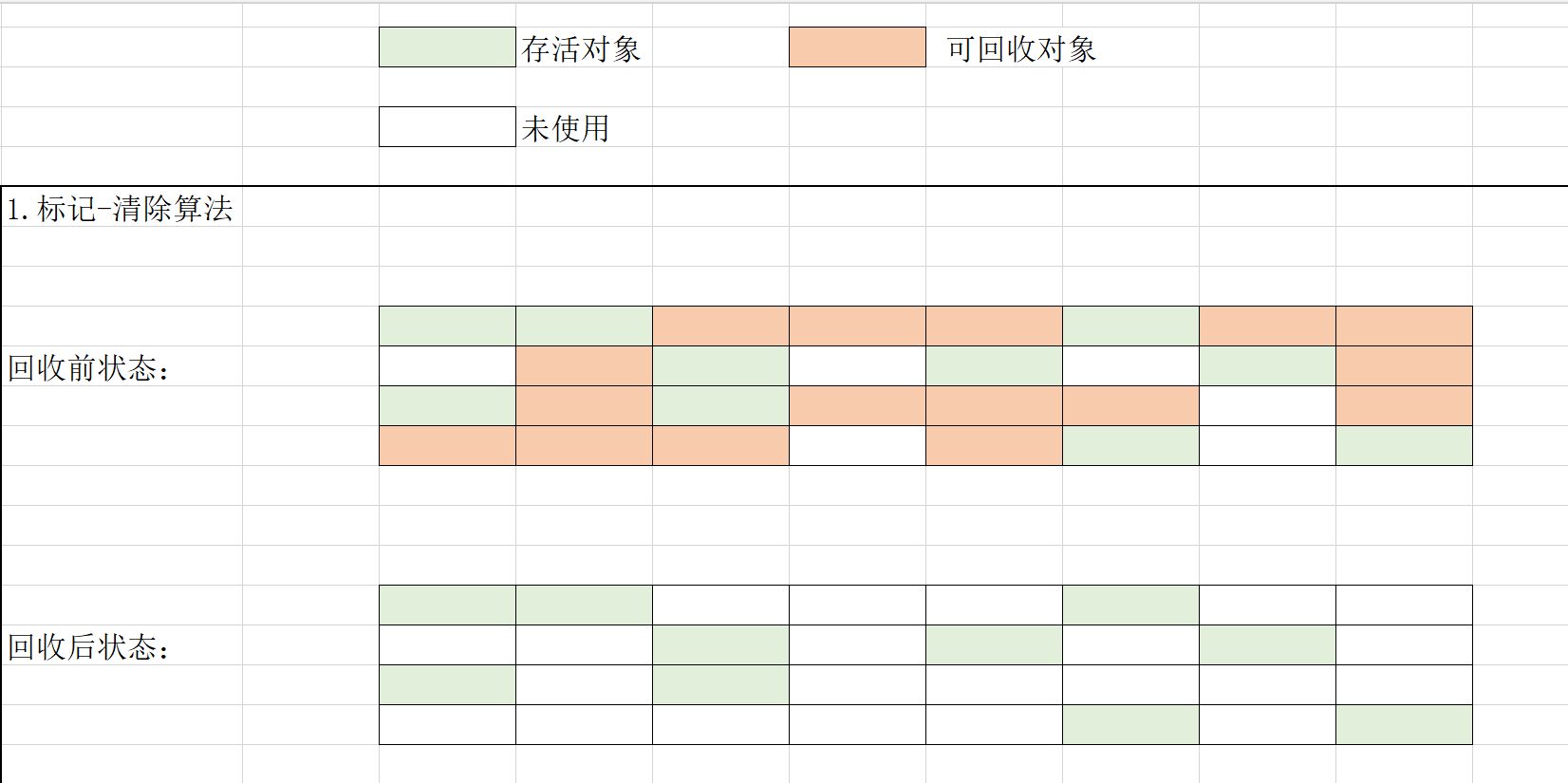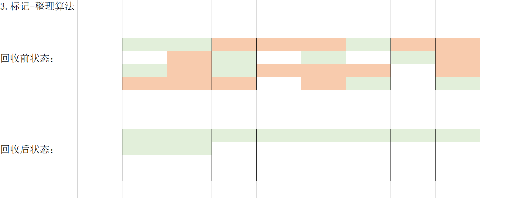 最基础的算法,分为两个步骤:1.对可以被回收的对象进行标记2.对标记的对象进行内存回收