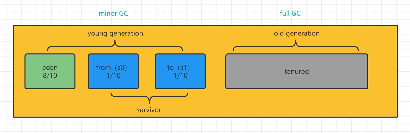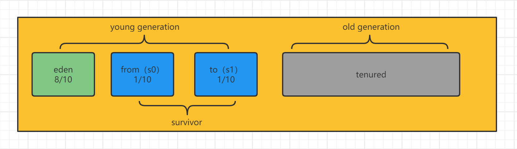 堆中内存分为两部分:新生代(young gen)和老年代(old gen),而新生代中又分为三部分:eden区、from区、to区,其中form区和to区又合称为生存区(survivor)