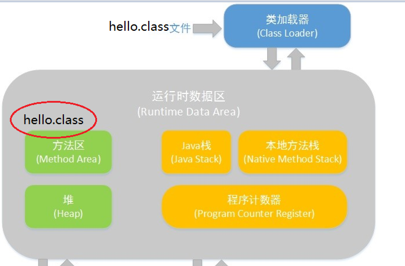 我们使用javac执行编译后,得到class文件,如果我们运行该程序,执行了main函数,其中对hello对象进行了实例化,那么JVM会加载该class文件,并存储到方法区(元空间)