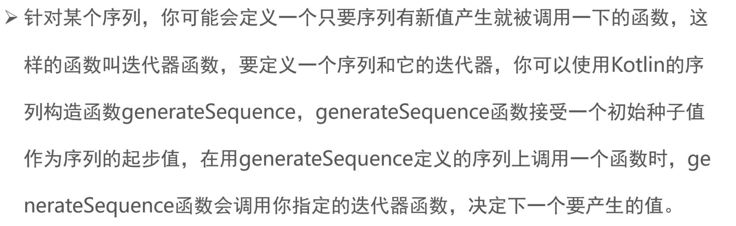 kotlin有个内置惰性集合类型叫序列,序列不会索引排序它的内容,也不记录元素个数,在使用一个序列时,它的元素可能有无限多,因为某个数据源能产生无限个元素