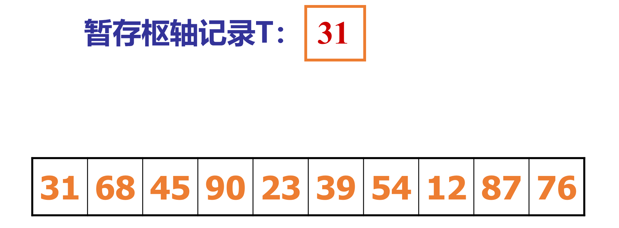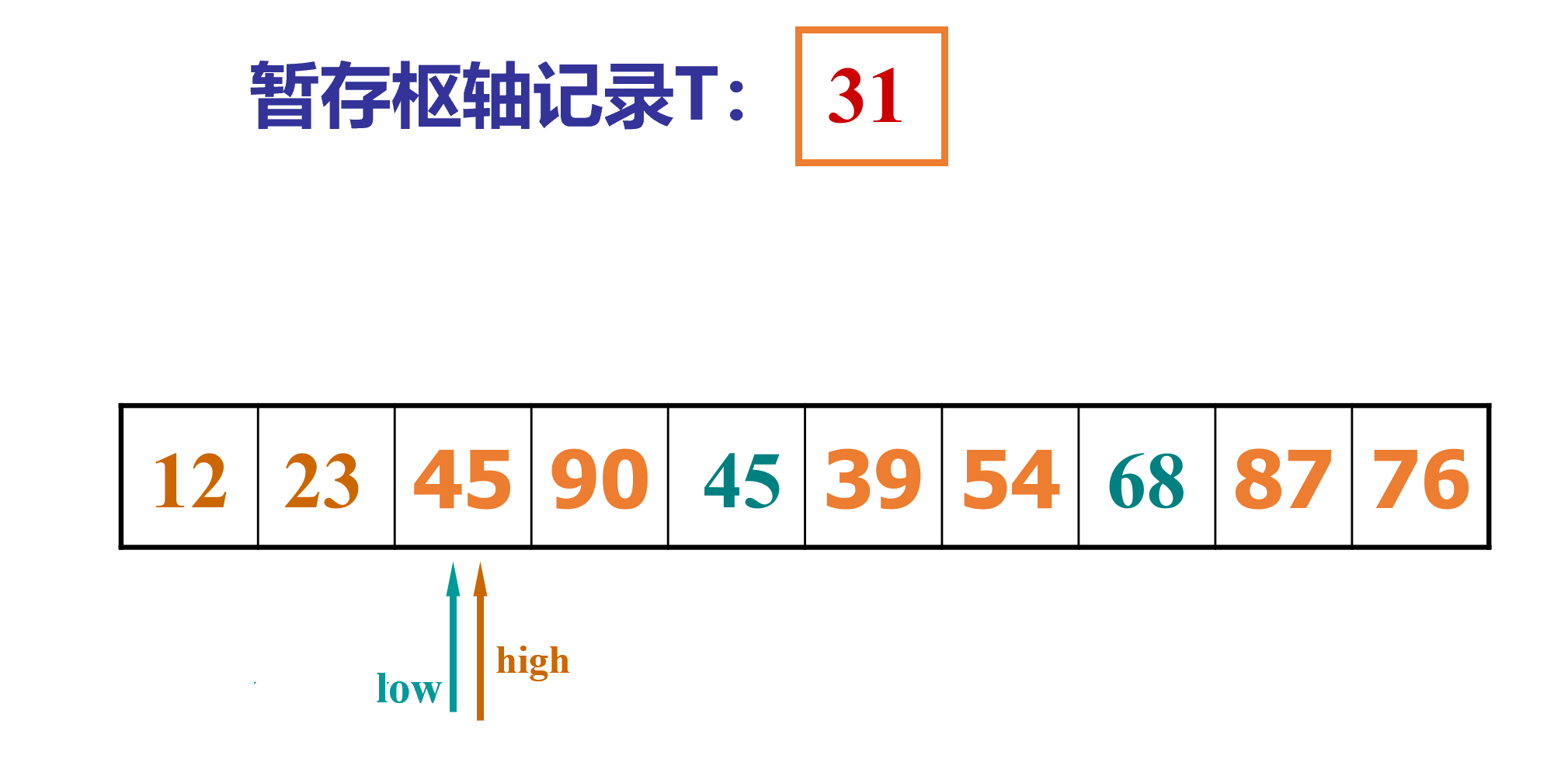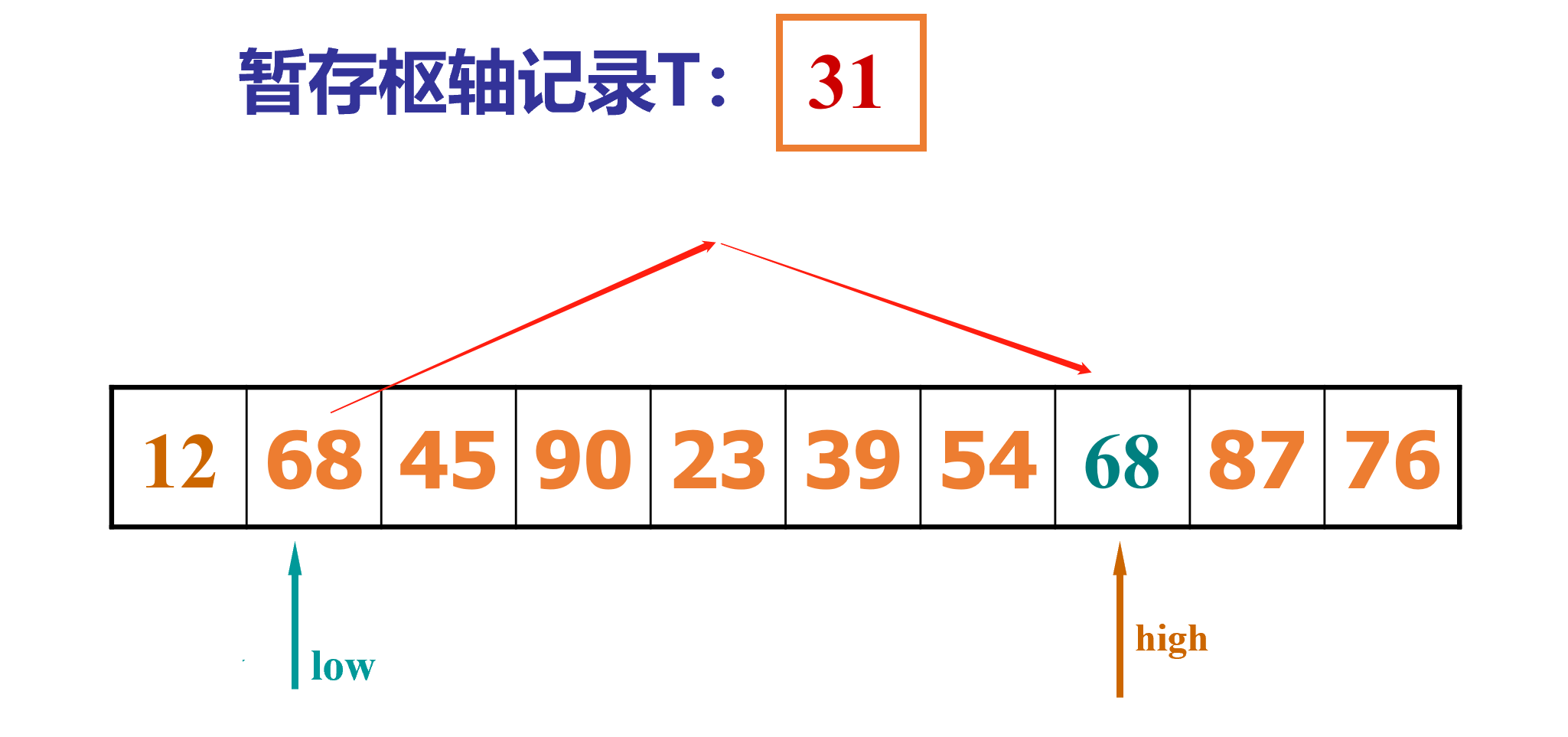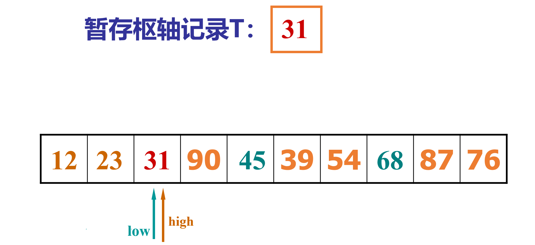 4.再从low位置开始查找,获取“比取出的元素“的值(31)大的索引,放入high指针位置