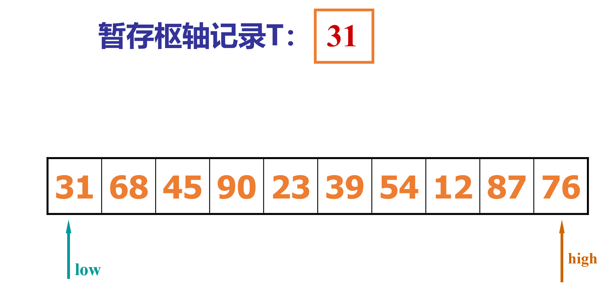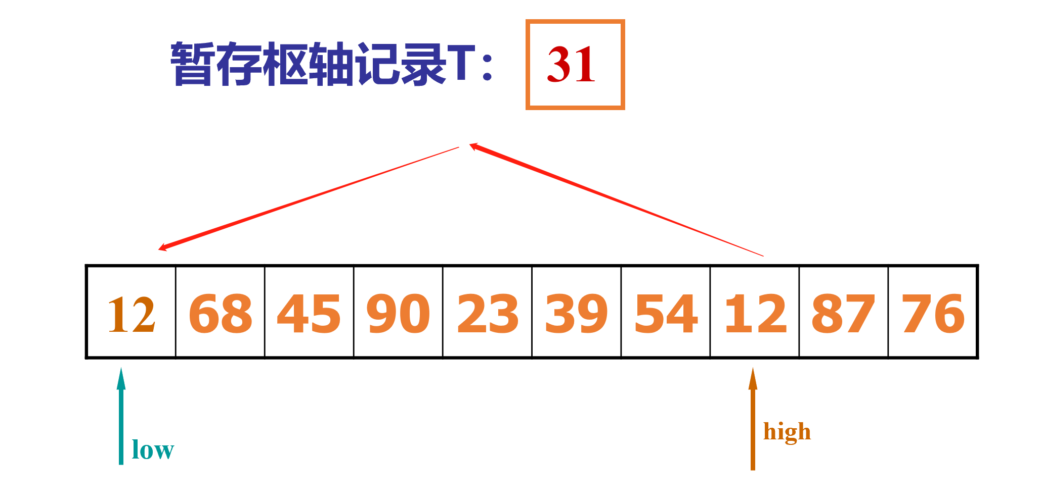 2.一个high指针指向数组尾,一个指针low指向数组头