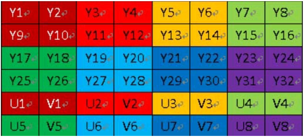 如果某一行是4:2:0,那么其下一行就是4:0:2,再下一行是 4:2:0,以此类推。对于每个色度分量来说,水平方向和竖直方向的 抽样率都是2:1,所以可以说色度的抽样率是4:1。对非压缩的8比特量化的视频来说,8×4的一张图片需要占用48字节的内存