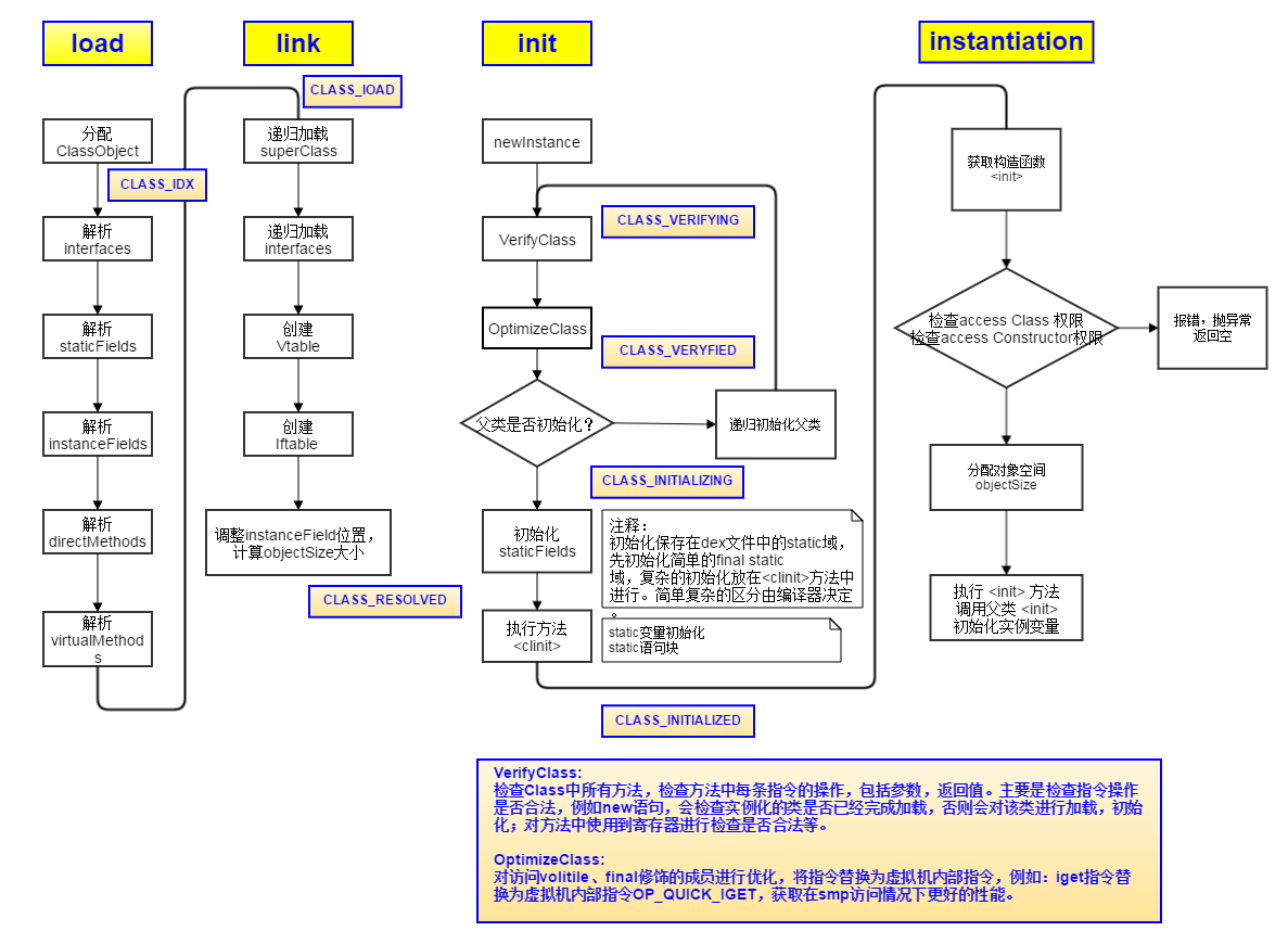 类加载最终会打上CLASS_INITIALIZED的标记,即上述结构体中ClassStatus对象为CLASS_INITIALIZED,只有有这个标记,它才能被正常使用
