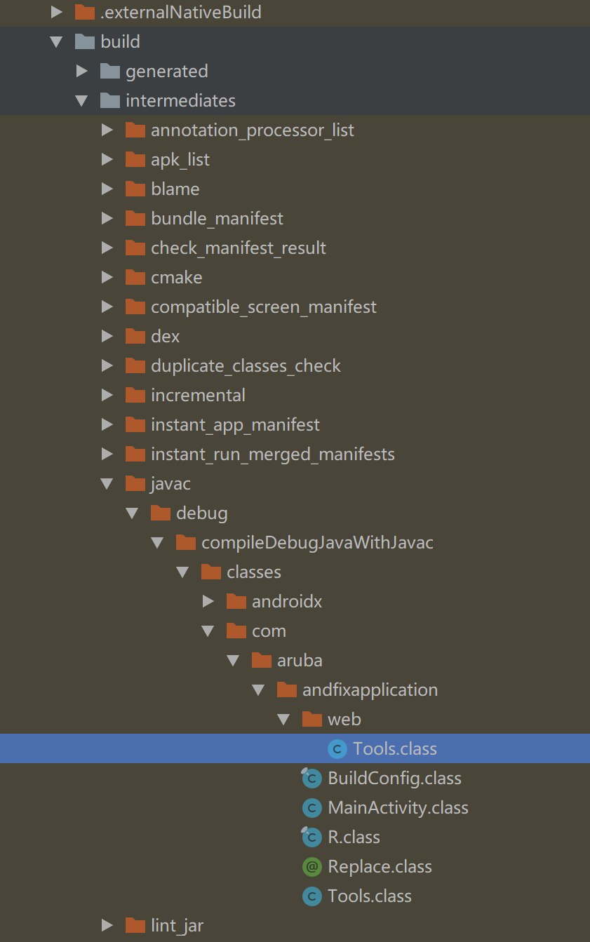 接下来我们需要加载新的Tools类的class,将方法指针替换,但是在我们安卓中,虚拟机并不是JVM,而是dalvik和art虚拟机,编译过程中会将class文件打包成dex文件,所以我们还需要手动将class打包成dex文件。我们在AS中build下,找到class文件