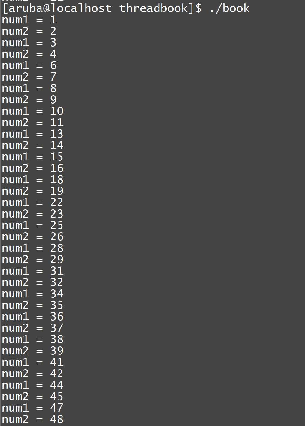 thread_start中对num进行++操作,thread_start1中打印num,并做++处理后再打印num,结果如下: