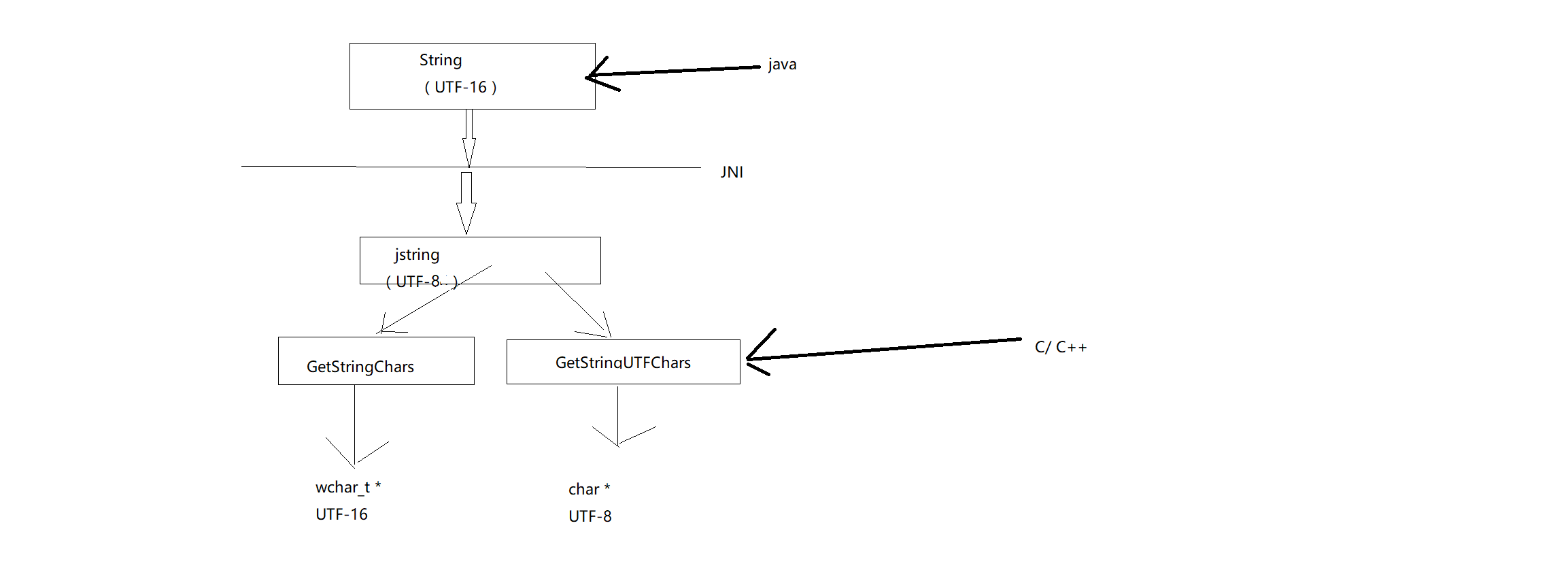 中文乱码了,这是因为Java的编码使用的是UTF-16,中英文每个占2字节(16bit),JNI使用的编码是UTF-8,英文占1个字节,中文占3个字节,C/C++英文编码为ASCII,中文为GB2312,中文占2个字节