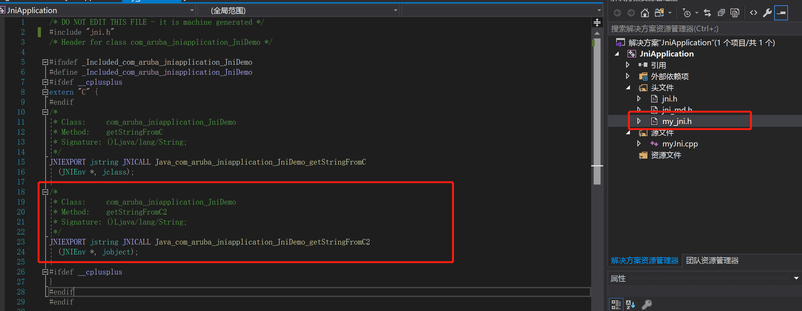 这边可以不需要每次都用javah命令,因为在c/c++中native方法的命名格式都是一样的,在之前.h文件中加入native方法,可以仿造之前的方法,只需要改变最后的方法名