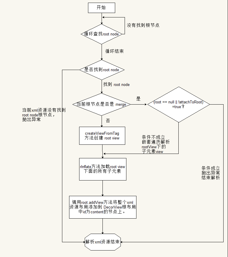 首先调用createViewFromTag(最终调用的是Acitvity的onCreateView方法)创建xml中根节点的View,然后调用root.generateLayoutParams方法并为根节点的View设置LayoutParams,此时的root为mContentParent(DecorView中id为content的FrameLayout),然后调用rInflateChildren方法