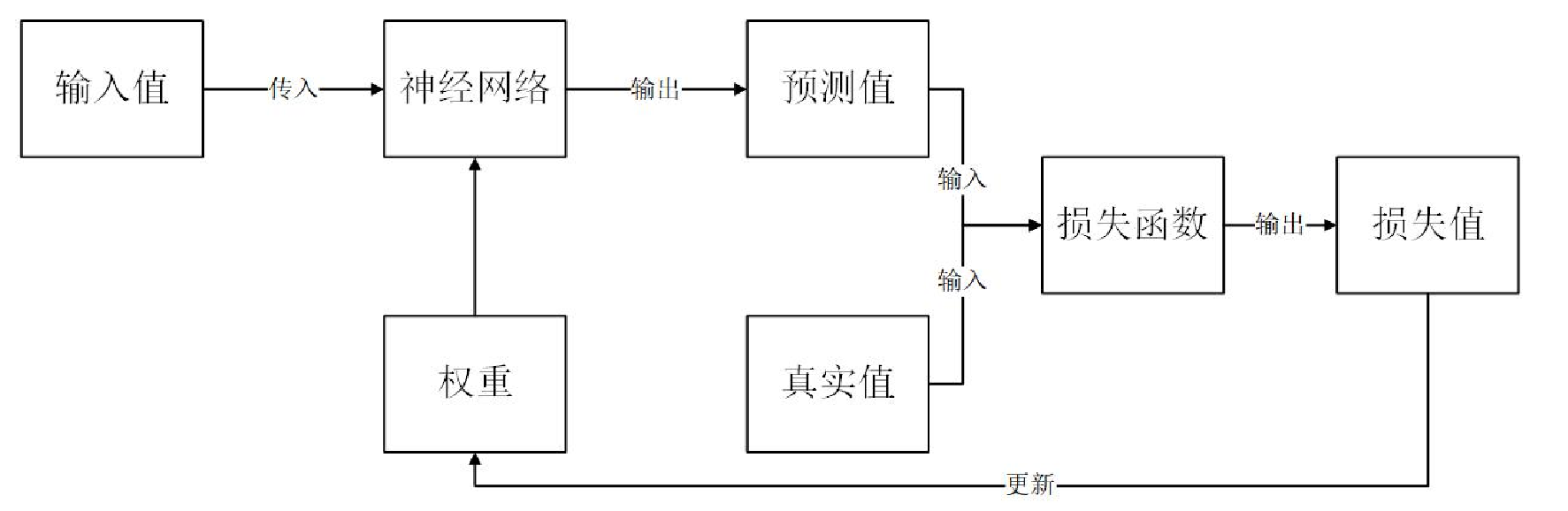 为了找到最适宜的权重,需要一个指标来对神经网络的输出值和真实值的差异进行评估,这个指标就是损失值(误差)。将网络的输出值和实际的真实值代入到损失函数,即可计算出二者的损失值。再利用误差反向传播算法,得到最为适宜的权重值,完成对神经网络的训练。神经网络训练流程如图所示: