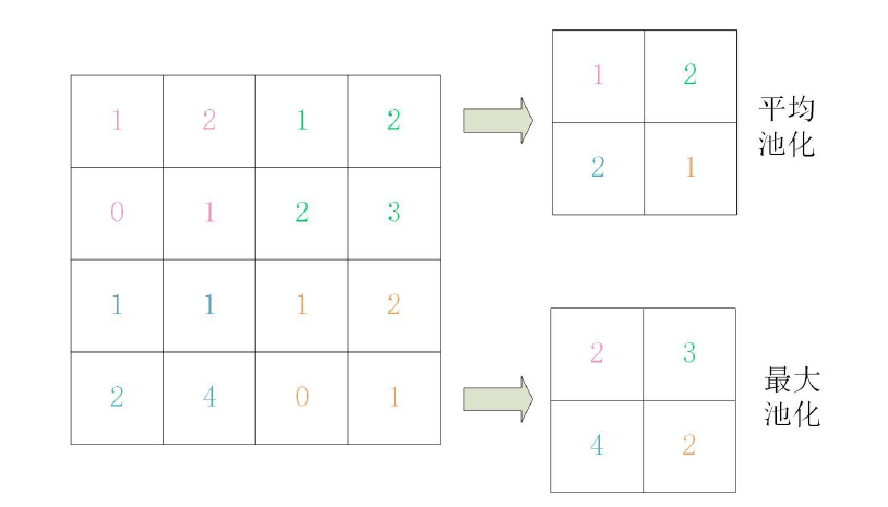 池化层进行池化运算。池化运算是缩小图像高度方向、长度方向的运算。常用的池化运算有最大池化、平均池化。平均池化是计算目标区域的平均值,最大池化是计算目标区域的最大值。例如,步幅为2、池化核大小为2的平均池化和最大池化如图所示。