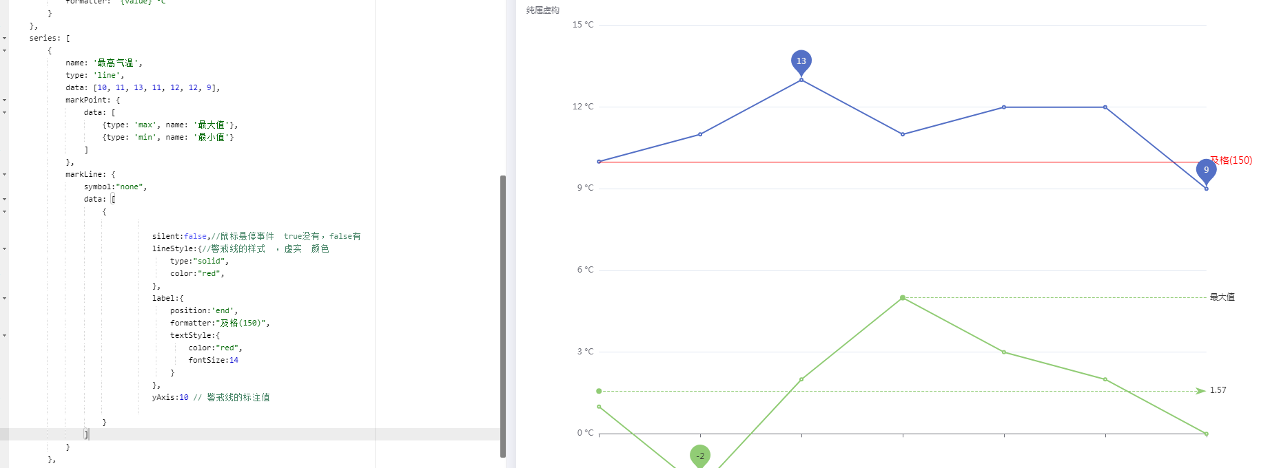 series: [ { name: '最高气温', type: 'line', data: [10, 11, 13, 11, 12, 12, 9], markPoint: { data: [ {type: 'max', name: '最大值'}, {type: 'min', name: '最小值'} ] }, markLine: { symbol:"none", data: [ { silent:false,//鼠标悬停事件 true没有,false有 lineStyle:{//警戒线的样式 ,虚实 颜色 type:"solid", color:"red", }, label:{ position:'end', formatter:"及格(150)", textStyle:{ color:"red", fontSize:14 } }, yAxis:10 // 警戒线的标注值 } ] } } ]