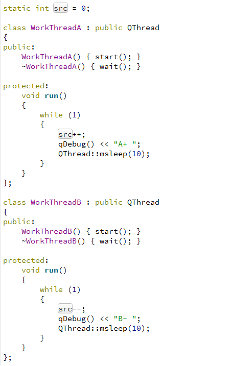 启用WorkThreadA和WorkThreadB各一个对象,则打印可能是“A+ B- B- A+ A+ ....”,也可能是"A+ A+ B- B- B-....", 某一时刻src的值每次运行都是不确定的。