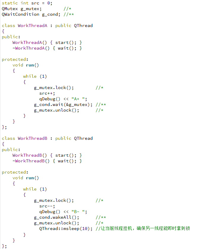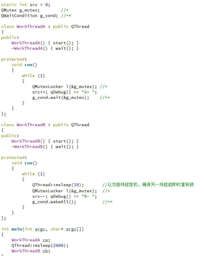 1、这里有一把锁g_mutex和一信号g_cond, 两个线程共用,相关部分打了注释*或**;